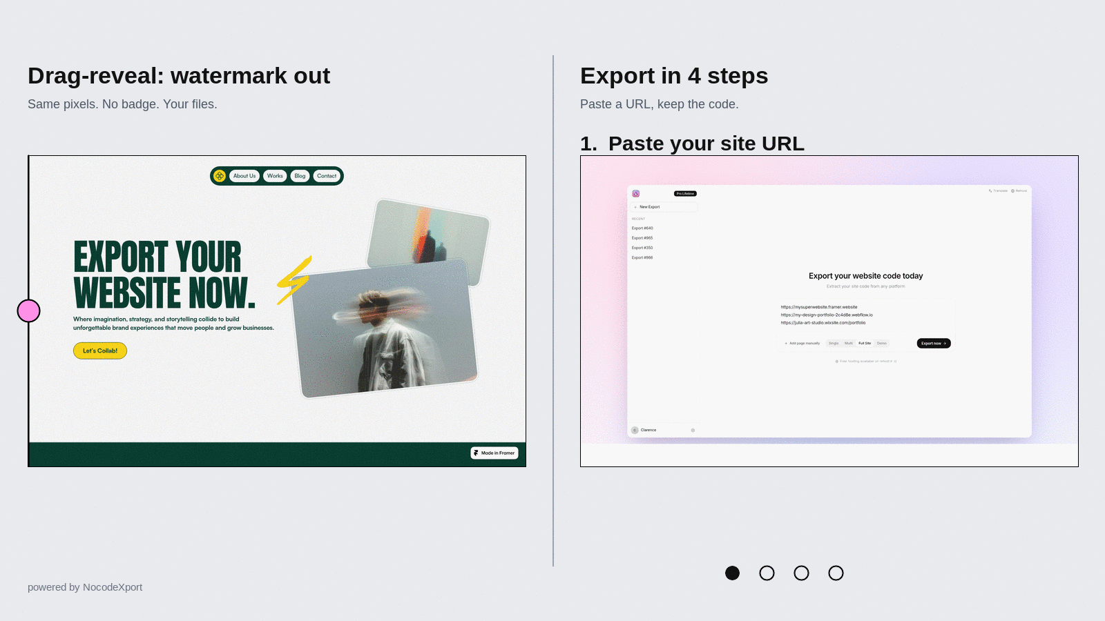Drag the slider. On the left, the free Framer, Webflow & Wix site we started from β watermark bottom-right. On the right, the exported build after NocodeXport: identical layout, identical fonts, identical animations, zero branding.